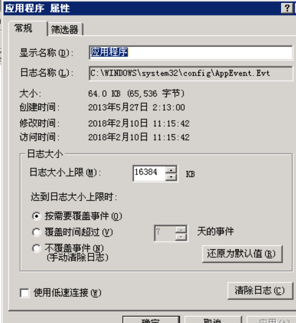 在事件查看器中右键应用程序(或安全性、系统、DNS服务器)查看属性可以得到日志存放文件的路径,并可修改日志文件的大小,清除日志。