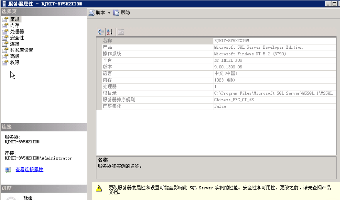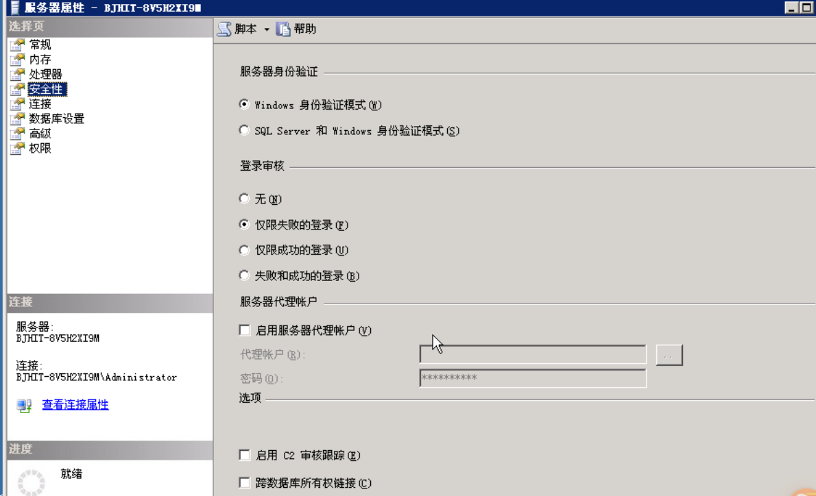 ④在“对象资源管理器”中,右击服务器,然后单击“属性”。