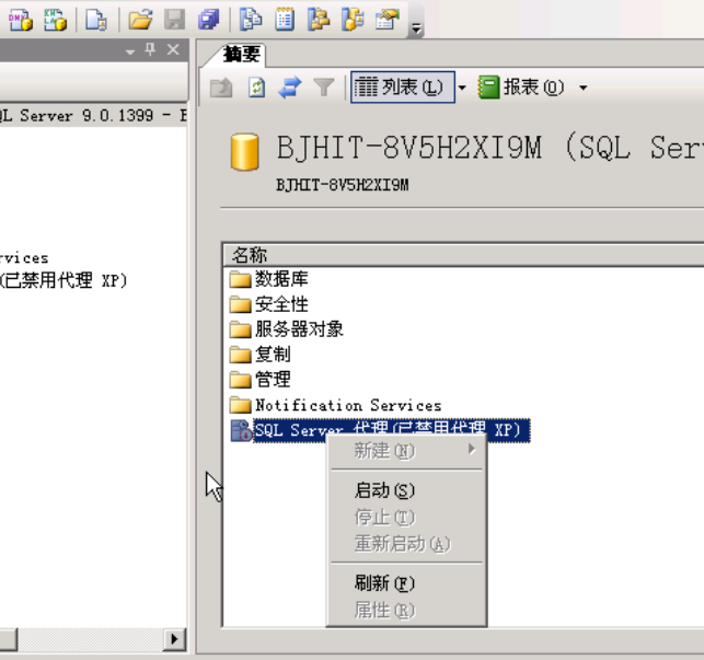 ⑨在“摘要”面板中,右击“SQL Server 代理”,然后单击“启动”。