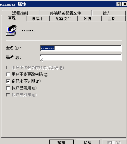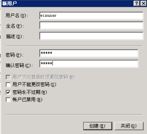 添加一个用户WinUser,并给该用户设置一个密码,本实验使用的密码是admin,密码可随意设置,但是需要记住,在后面需要用到,把用户下次登录时须更改密码前面的勾选去掉,把密码永不过期的选项选上,然后点击创建,设置如图: