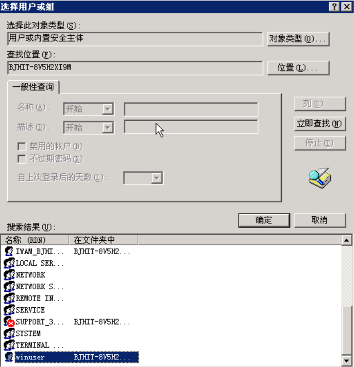 点击右侧的立即查找,在搜索结果中,找到winuser并选择该用户,然后点击确定。
