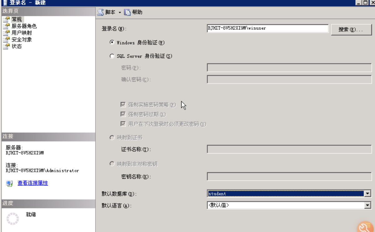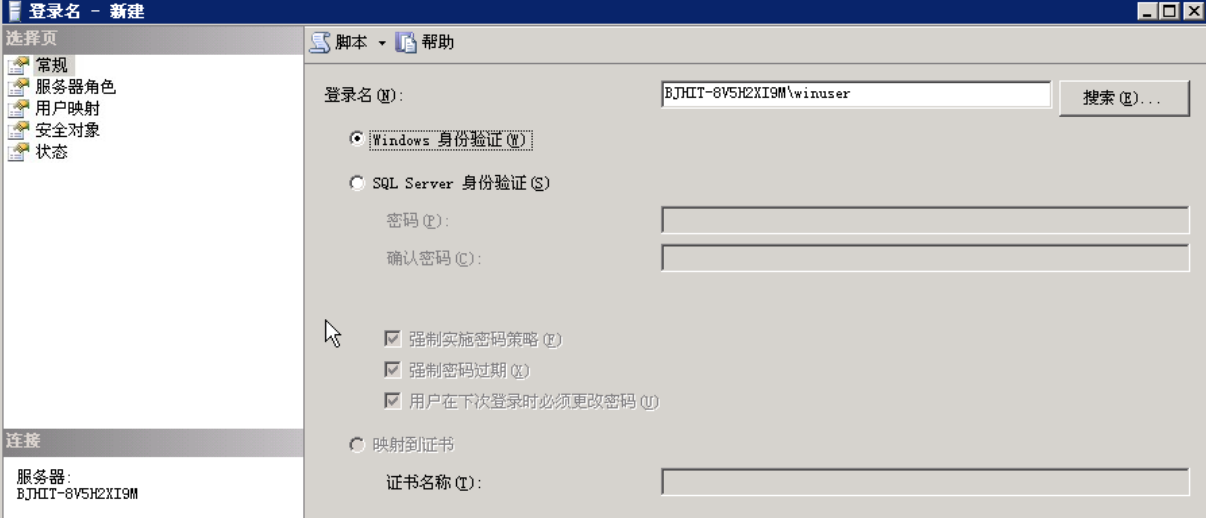 在对象资源管理器中,展开安全性-登录名,可以看到winuser已存在。