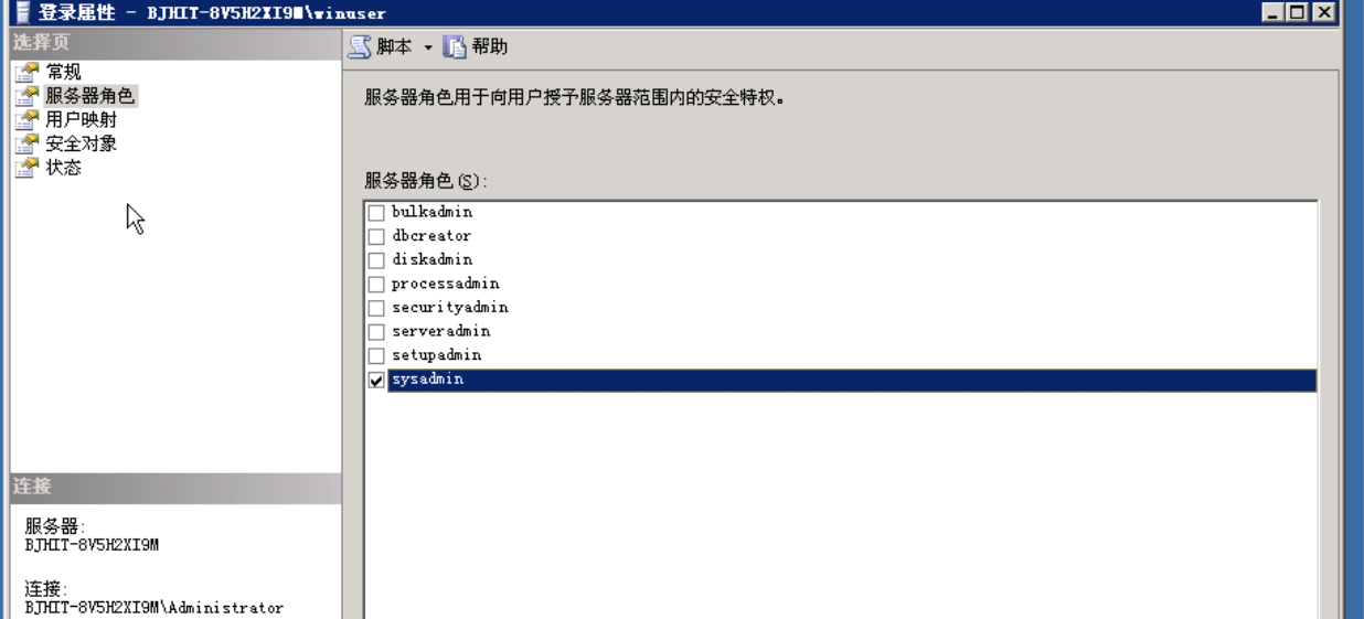 ③选择“服务器角色”选项卡。可以在服务器角色列表框中选择相应的服务器角色成员。在这里,设置登录用户winuser的服务器角色为系统管理员。