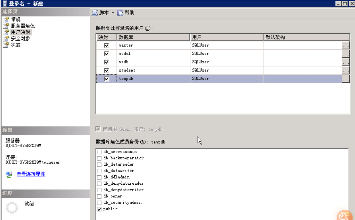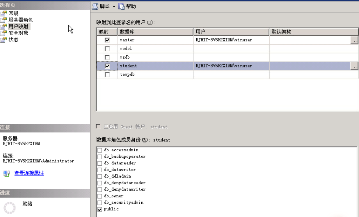 ④选择“用户映射”选项卡,在列表框中列出了该账号可以访问的数据库,如果单击数据库左边的复选框,表示该用户可以访问相应的数据库。在这里,选中数据库master和student左边的复选框,表示登陆用户winuser可以访问的数据库为master和student。在下方的数据库角色成员身份都选择public。然后点击确定。