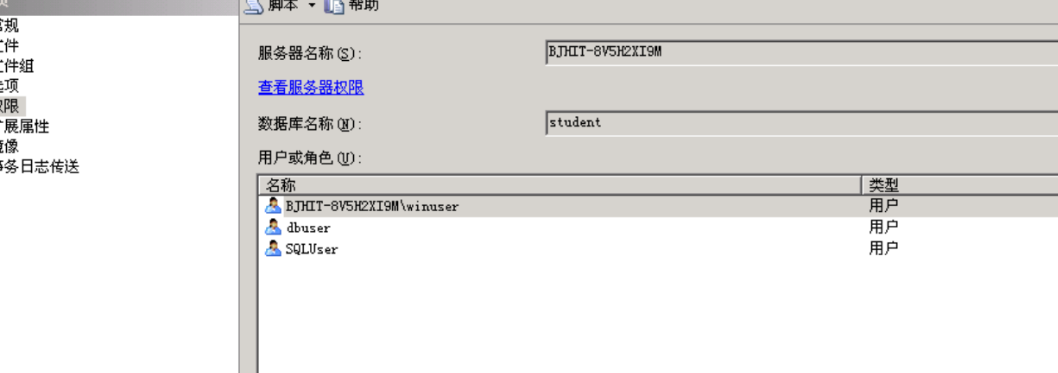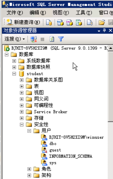 同时,展开数据库-student-安全性-用户,在用户列表中可以看到数据库student中已经建立一个数据库用户winuser。