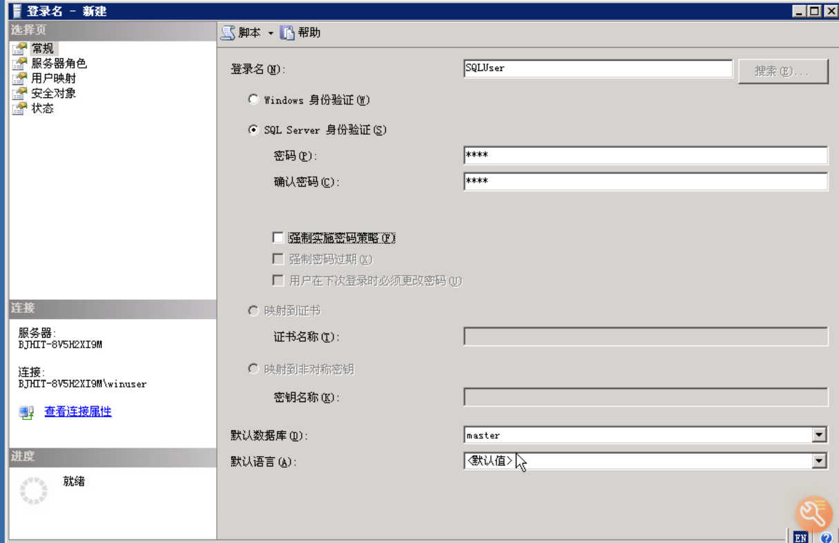 ②在登录名输入框内输入需要新建的用户名,这里新建的用户名是SQLUser。验证方式选择SQL Server身份验证,然后在密码框输入SQLUser的密码。这里设置成test。把强制实施密码策略的复选框去勾选去掉,默认数据库选择master,然后点击确认。