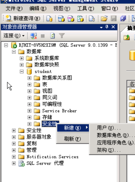 打开SQL Server Management Studio,展开服务器-数据库,选择要创建用户的数据库,如student,展开student,用鼠标右键单击“安全性”节点,从弹出的菜单中选择“新建-用户”命令。