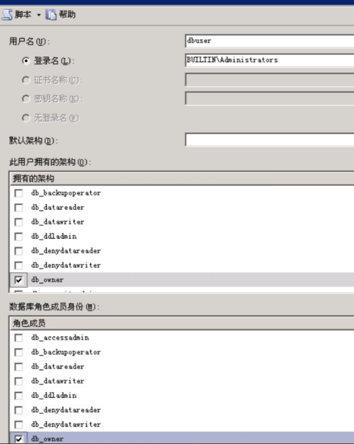 在此角色拥有的架构中选择db_owner,然后点击确定,完成角色创建。