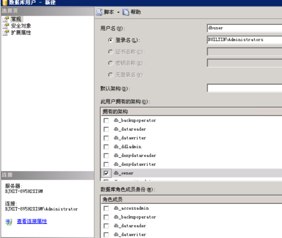 点击确定,在此用户拥有的架构勾选db_owner,数据库角色成员身份同样选择db_owner,单击“确定”按钮,即可完成数据库用户的创建。