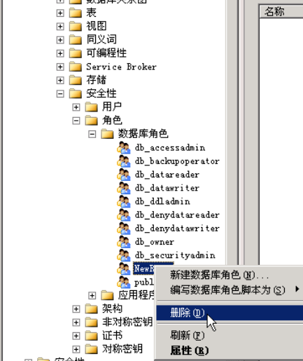 在SQL Server Management Studio中,用鼠标右键单击要删除的自定义角色,如NewRole,从弹出的菜单中选择“删除”命令即可删除自定义角色。(注意:不能删除一个有成员的角色,在删除角色之前,应先删除其成员。)