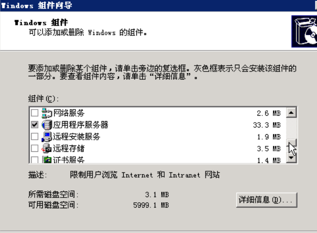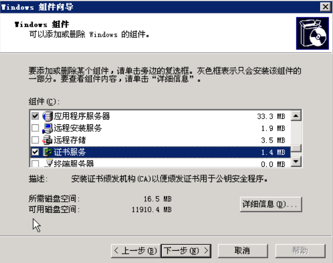 依次点击:“添加删除windows组件”,在组件向导中选中“应用程序服务器”与“证书服务”,先不要点击下一步: