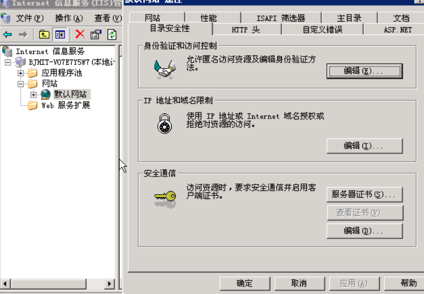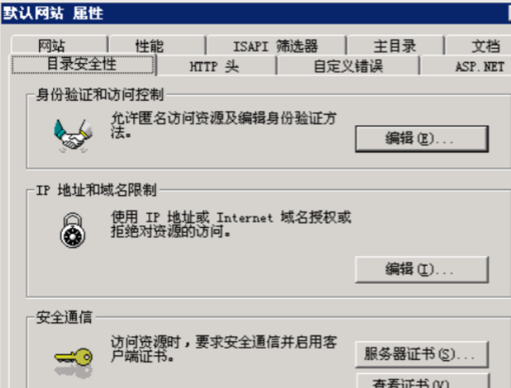 打开默认网站属性,选择“目录安全性”标签,单击“编辑”
