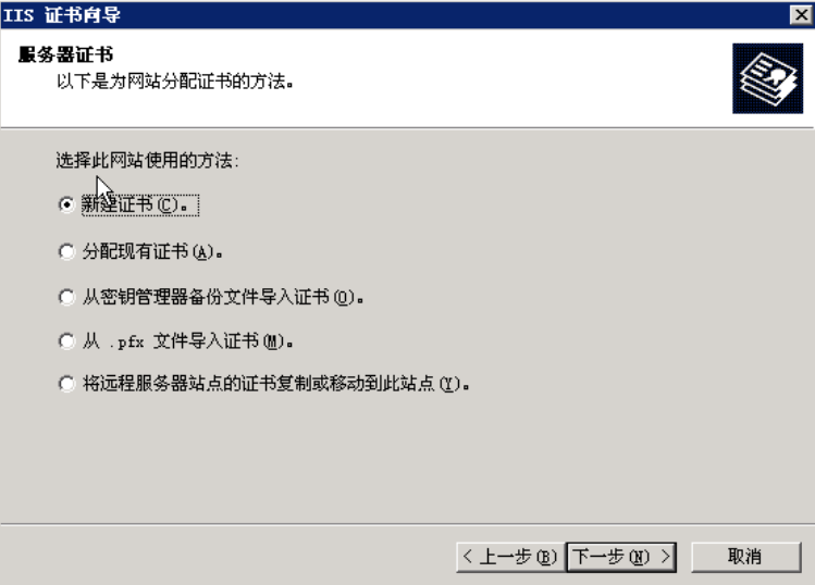 出现如下对话框,保持默认选项“新建证书”不动,继续下一步: