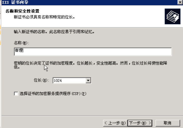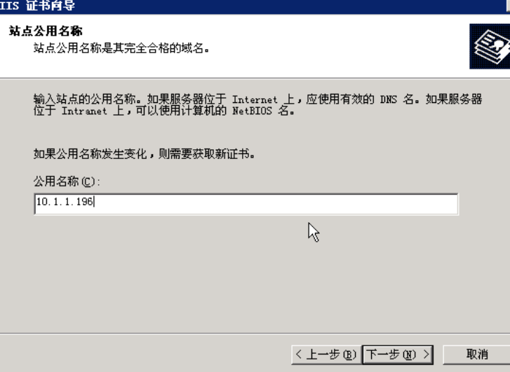 填写公用名称,由于在本环境中没有使用DNS服务器,没有域名因此使用IP地址访问,在公用名称中输入本机的IP地址,如果名称错误,后面过程中会出现问题,因此应仔细核对: