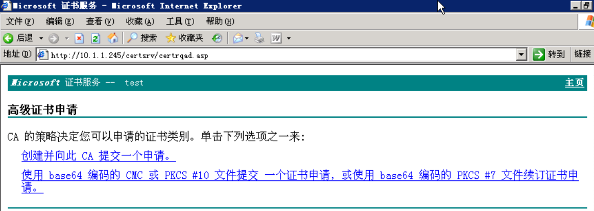 在下图的页面中点击“高级证书申请”:
