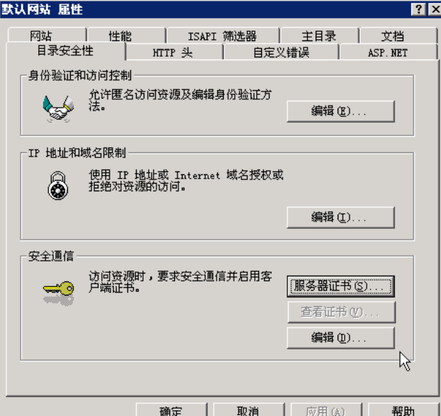 在“默认网站属性”中选择“目录安全性”标签,点击“服务器证书”: