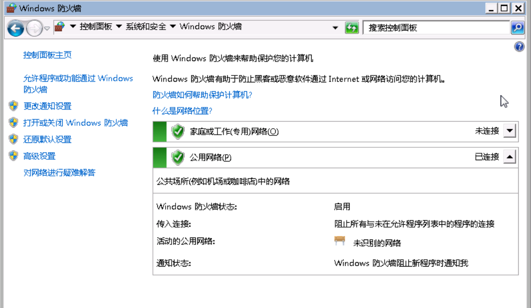 通过点击:开始-->控制面板-->系统和安全-->Windows 防火墙,出现“Windows防火墙”页面: