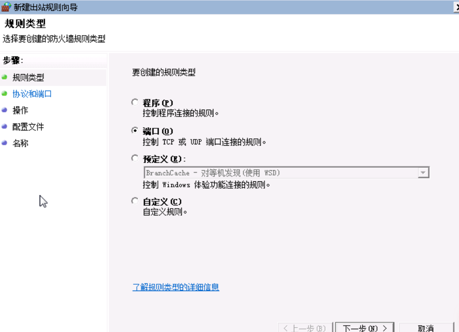 2)首先是“规则类型”配置,选择“端口”,并点击“下一步”。如下图: