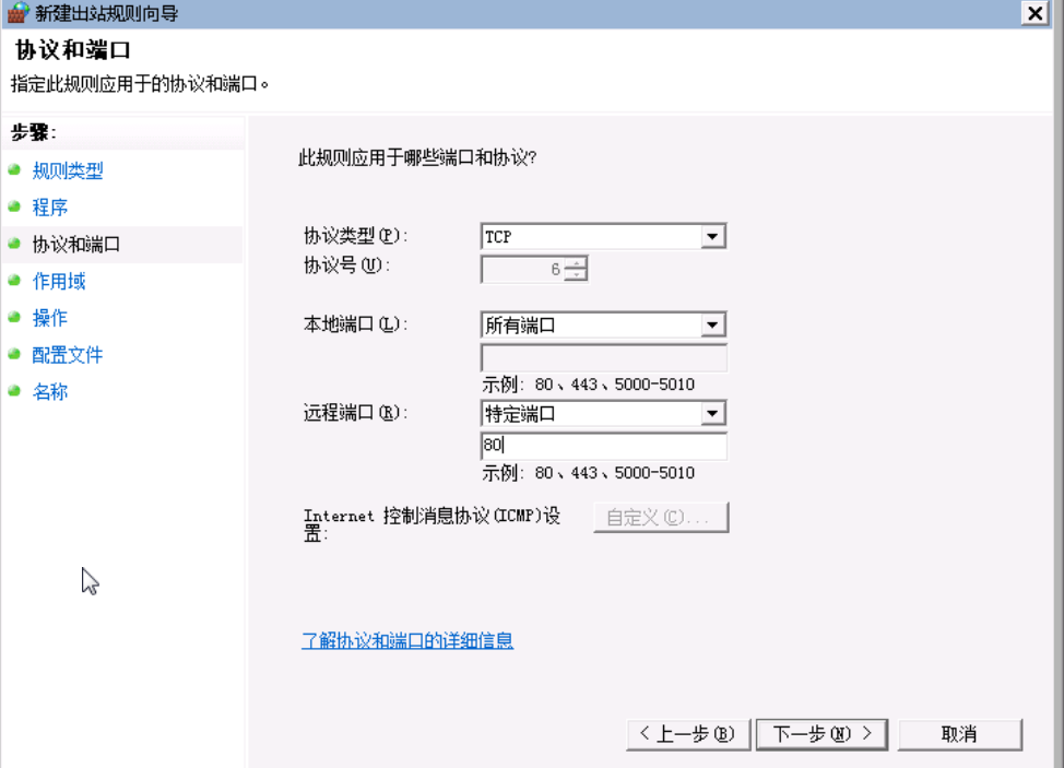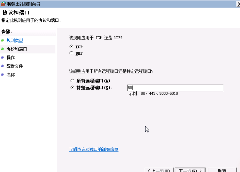 3)在“协议和端口”配置界面,选择“TCP”,选择“特定远程端口”,输入“80”,点“下一步”。见下图: