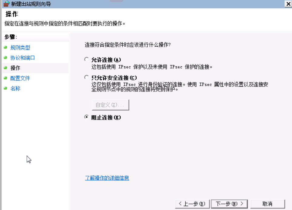 5)在“操作”界面,选择“阻止连接”,点“下一步”。