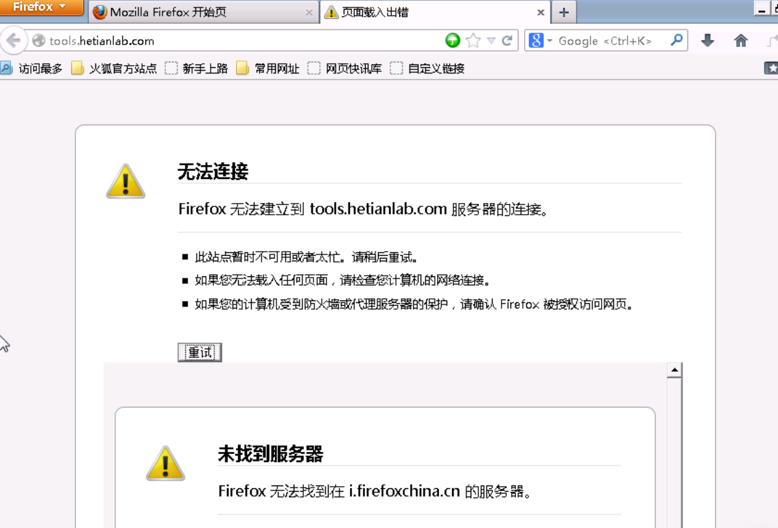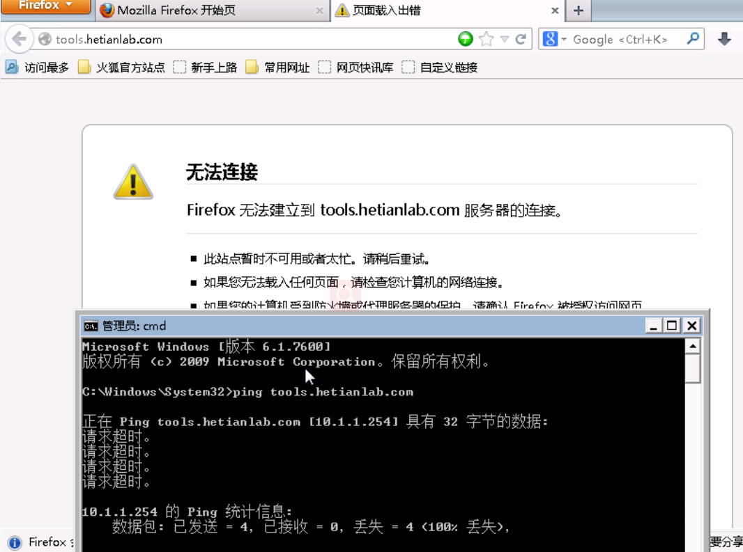 打开浏览器,此时已经无法访问http://tools.hetianlab.com。但可ping通。截图中返回了IP地址说明是通的,请求超时只是网站为了安全而设置的禁ping策略。