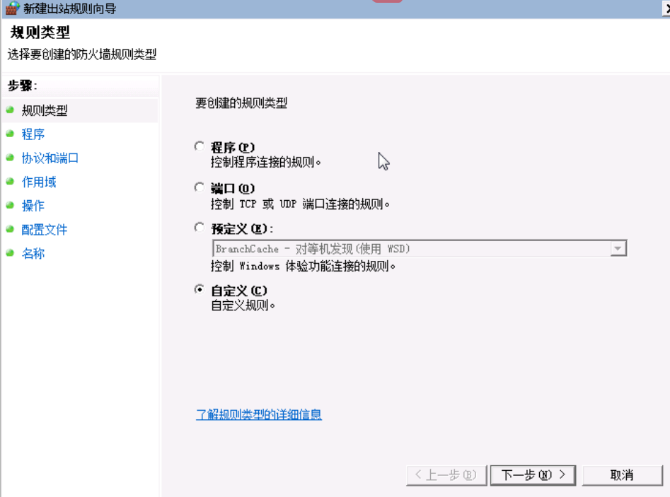 1)新建规则(出站规则),规则类型选“自定义”,点“下一步”。
