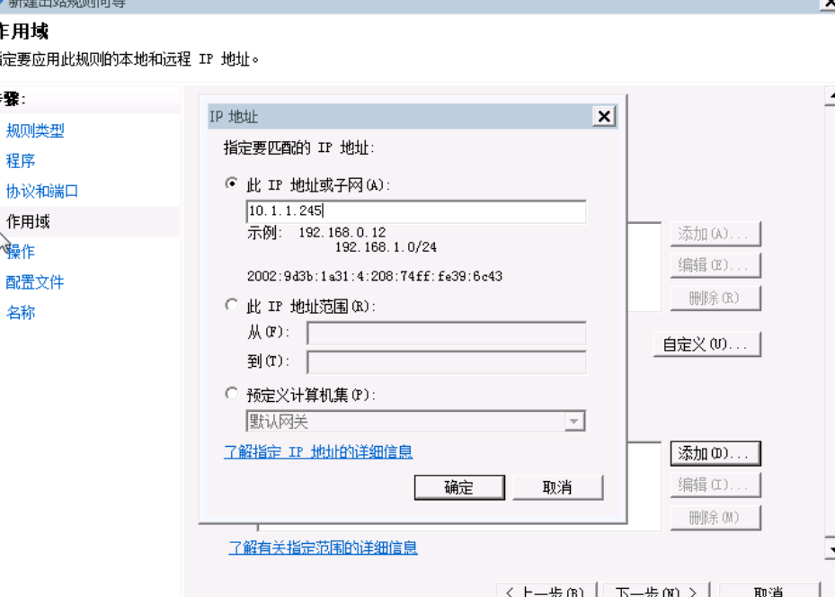 4)在“作用域”界面,点击“添加”,将弹出“IP地址”对话框,输入网址的IP地址,获取IP的方法为CMD 里ping tools.hetianlab.com,点击“确定”,回到“作用域”后,点击“下一步”。见下图: