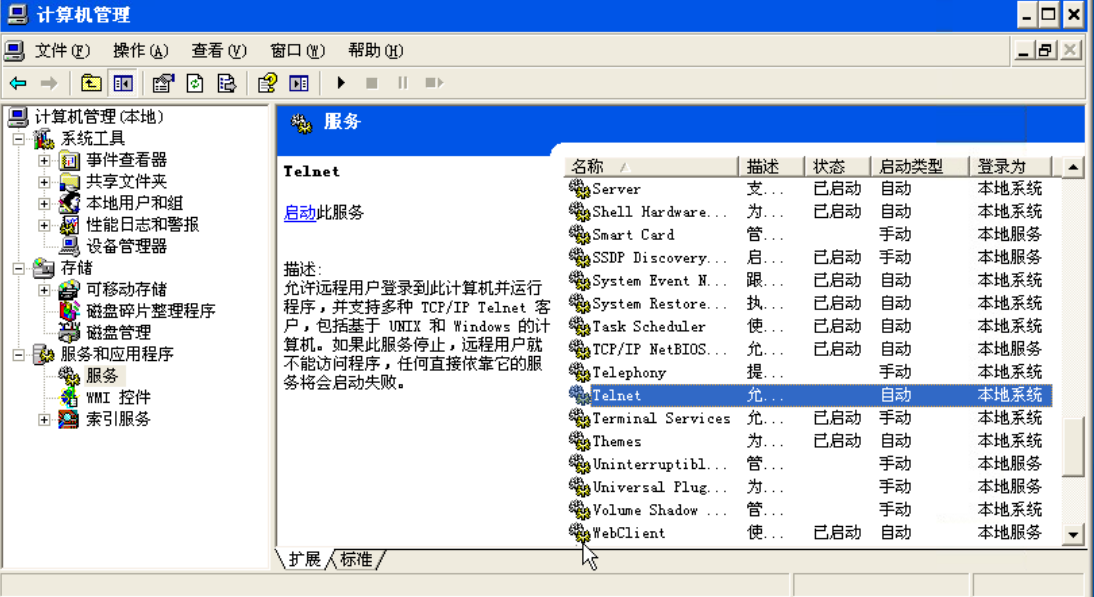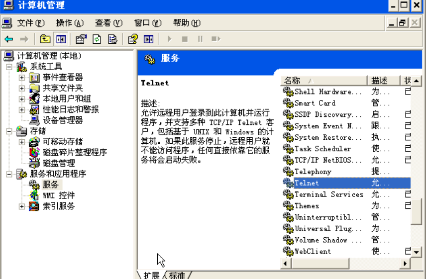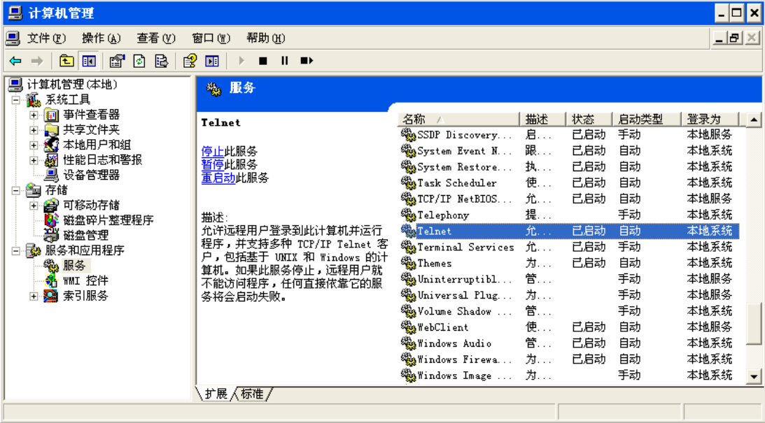 进入主机A,右键“我的电脑”->管理->服务和应用程序->服务,找到Telnet服务,如图所示: