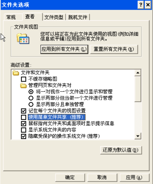 (2)在主机B的“控制面板-工具-文件夹选项-查看-简单的文件共享”去掉选取。