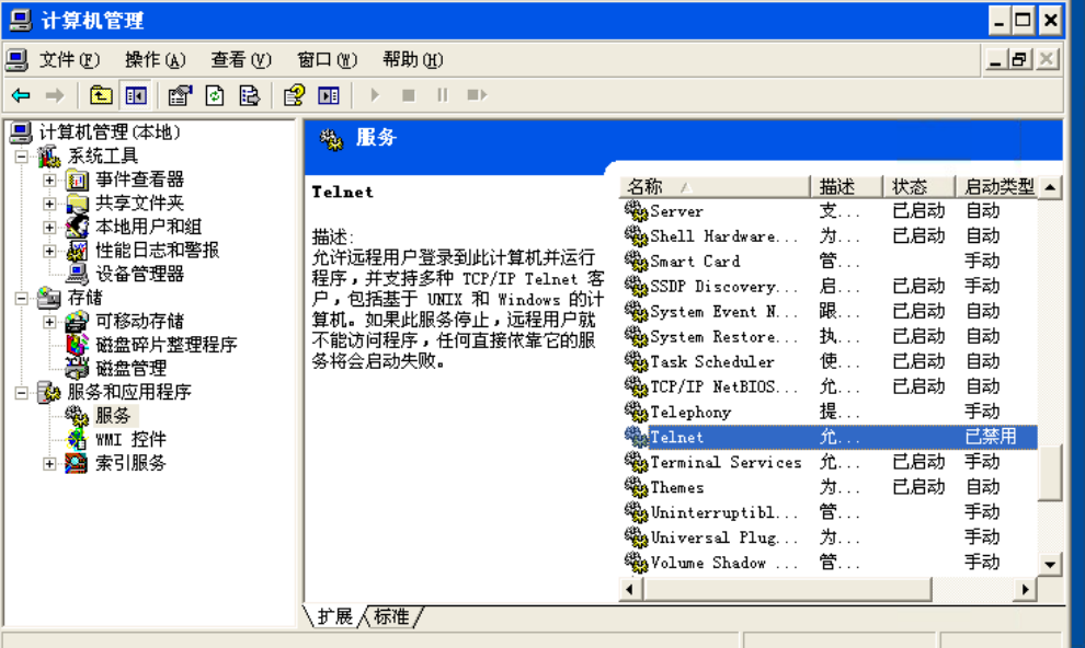 (3)右键“我的电脑”->管理->服务和应用程序->服务,找到Telnet服务,关闭之: