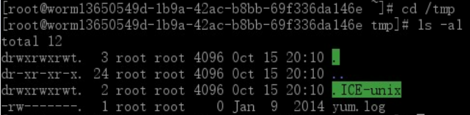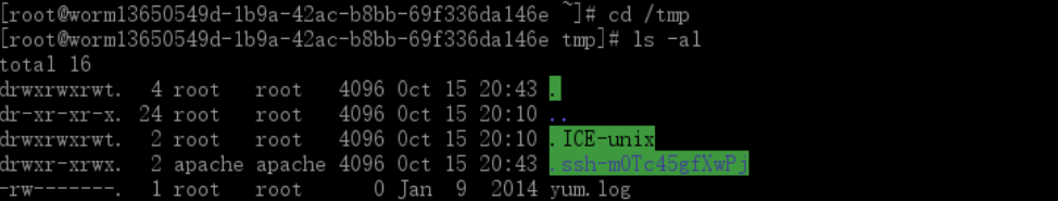 2.经过一段时间之后,登录Worm2。同样使用命令:”ls -al /tmp”查看,可以发现主机也被此蠕虫感染。对比效果如下图: