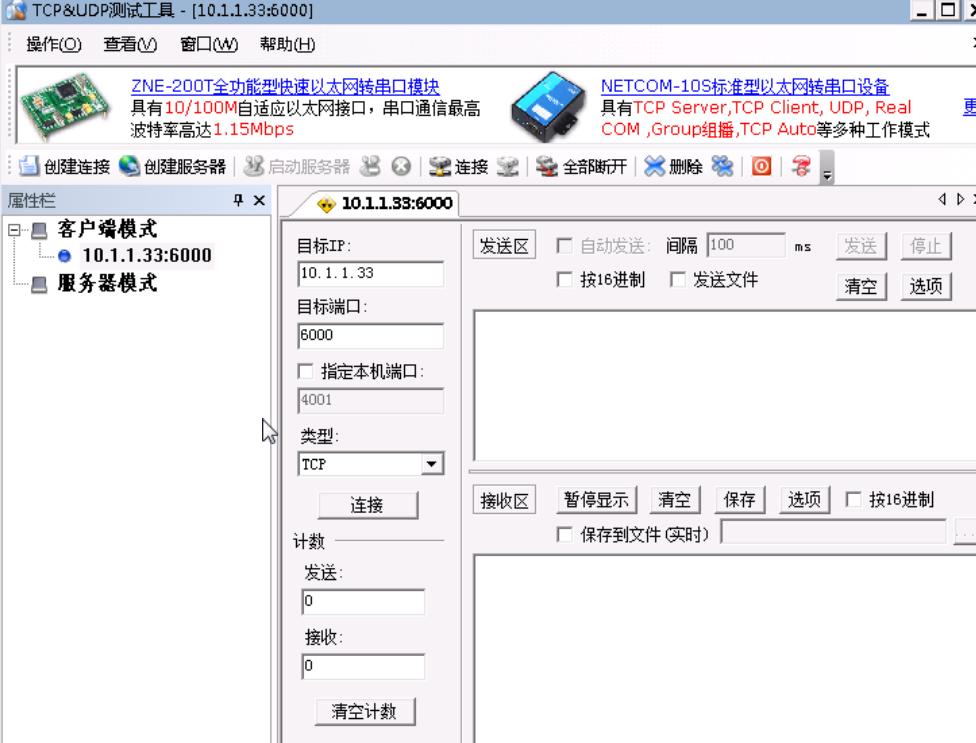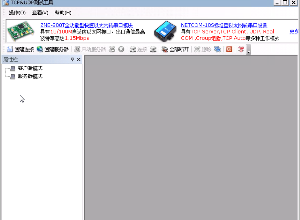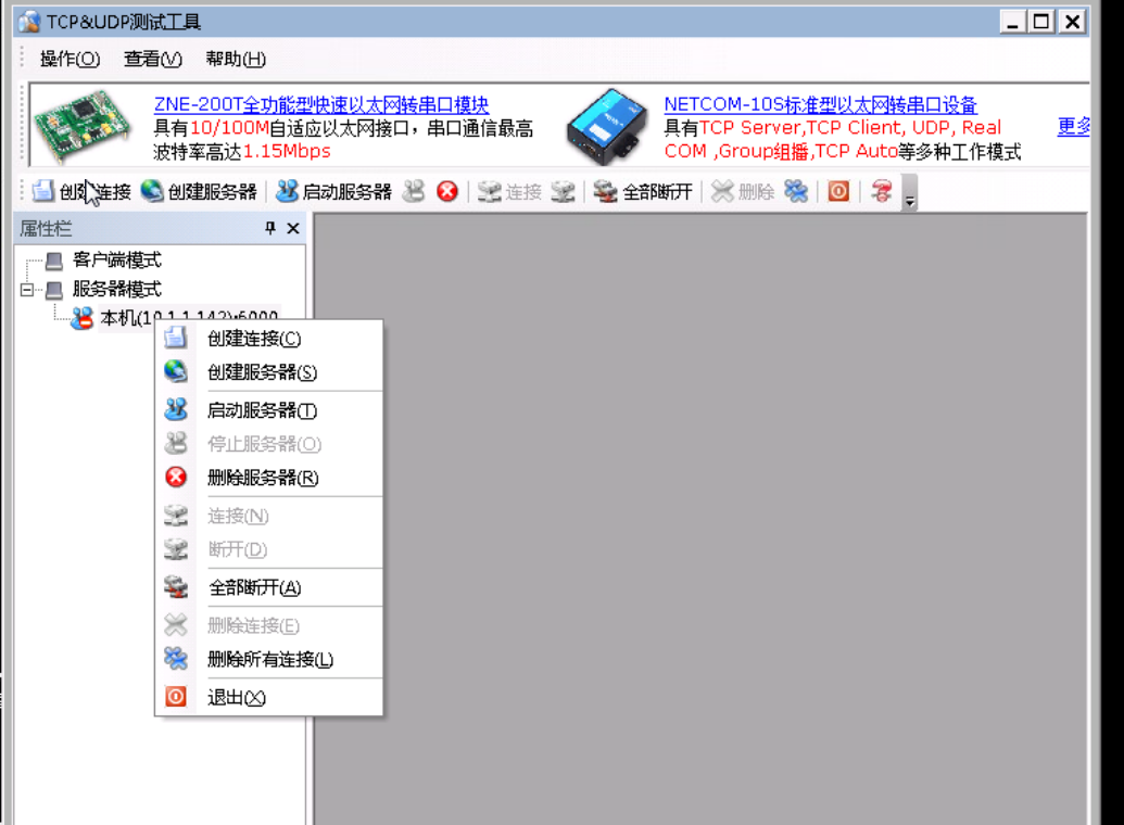 选择10.1.1.33的机器,双击桌面的" TCP&UDP测试工具",右键点击服务器模式,在下拉列表中,选择创建服务器,如下图: