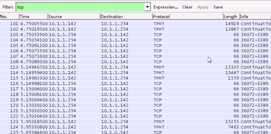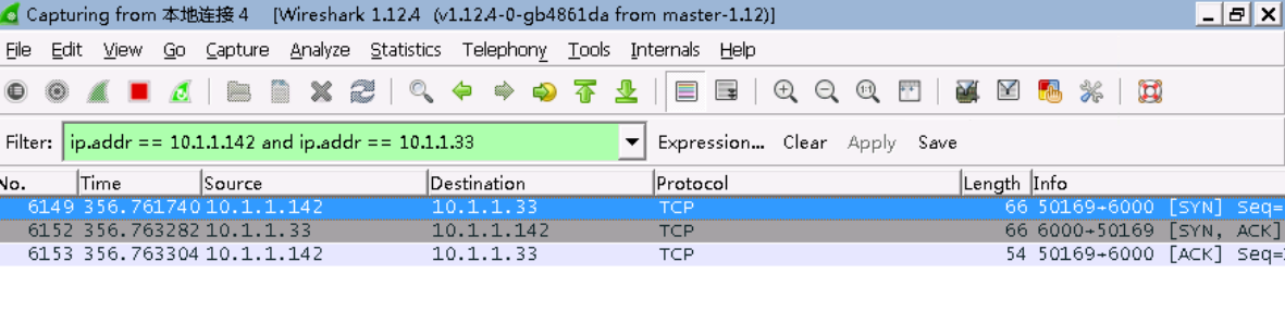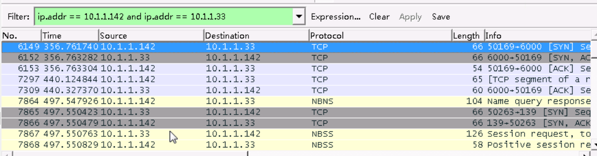 我们可以看到,有很多的数据,不方便查看。在这里,我们已知两台机器的IP情况下,可以在filter中输入"ip.addr == 10.1.1.142 and ip.addr == 10.1.1.33"来过滤出我们想要的数据,点击工具中的"连接"按钮。如下图