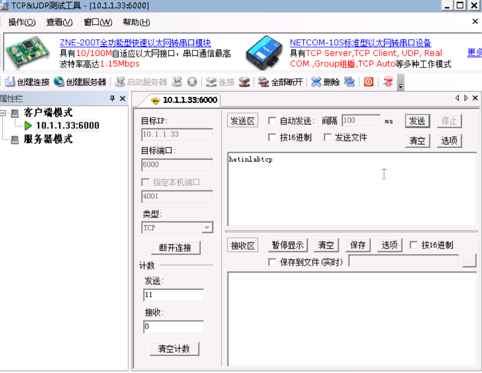 在发送区域输入"hetinlabtcp"点击发送,会持续的更新TCP数据。