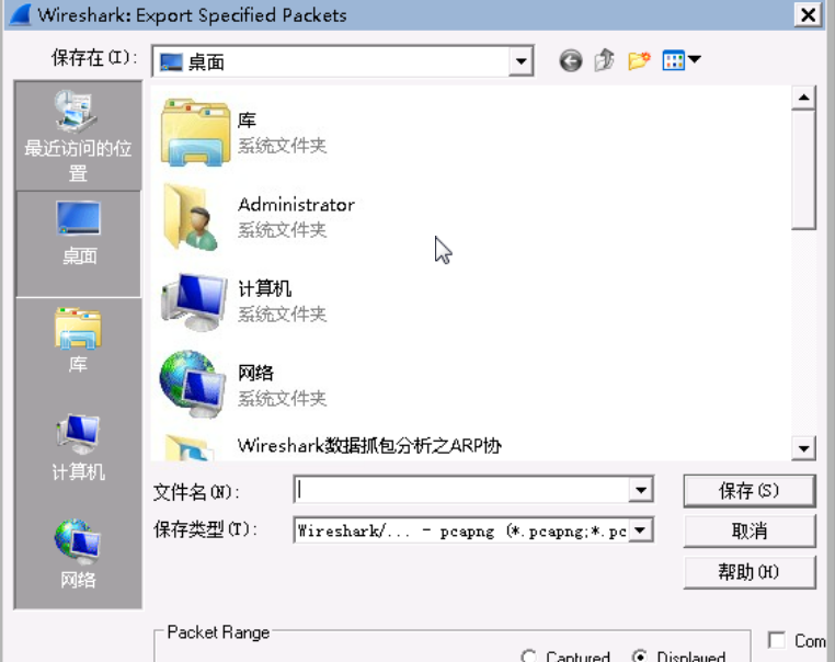 在Wireshark的菜单栏中,依次选择FIle->Export Specified Packets 命令,打开如下所示页面