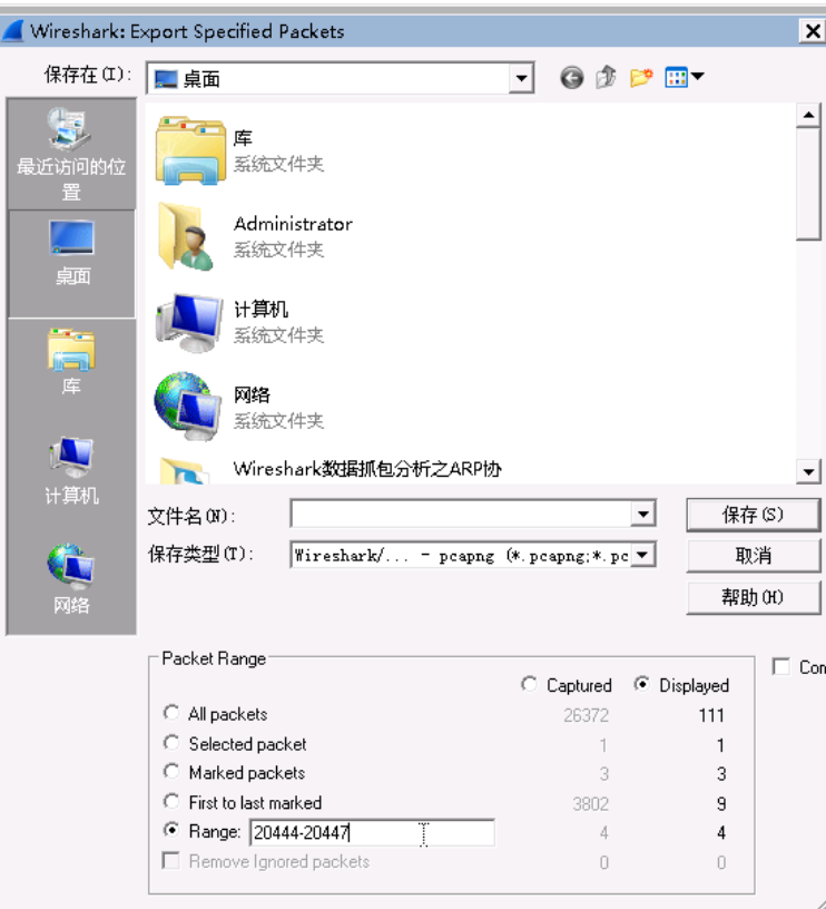 选择Marked packets,并选择保存名字和路径,即可。下面来保存四次断开的数据,因20444,20445,20446,20447为连续的序号,所以在Wireshark的菜单栏中,依次选择FIle->Export Specified Packets 命令,打开如下所示页面