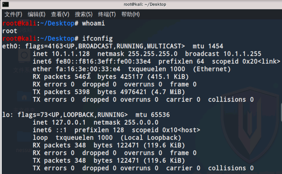 3.查看攻击者主机登陆用户及网络配置信息,从下图3可以看出攻击主机登陆用户为root ,IP为10.1.1.128