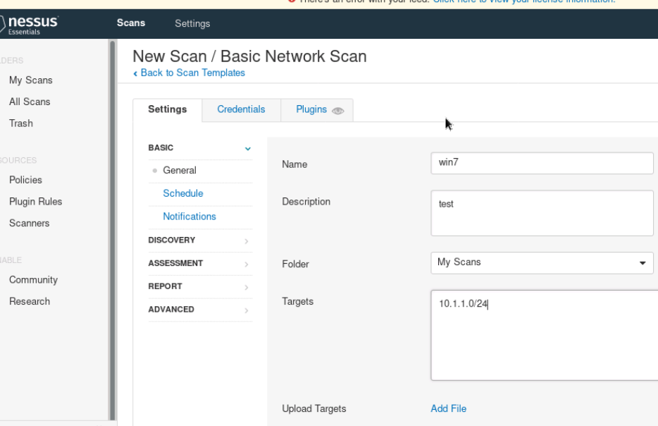 配置扫描信息,主要设置扫描名称、描述和扫描目标三个信息即可,其他配置选择默认,配置完成点击Save。选择对整个10.1.1.0/24网段进行扫描,如下图所示。
