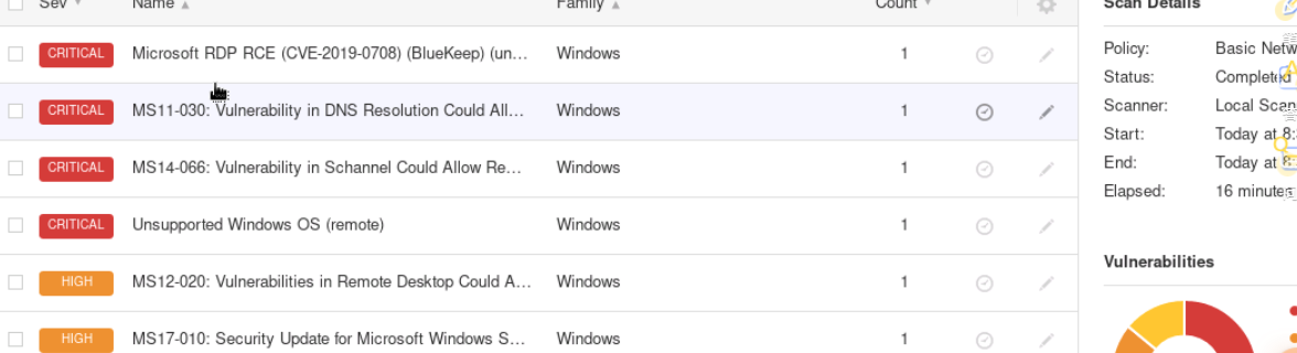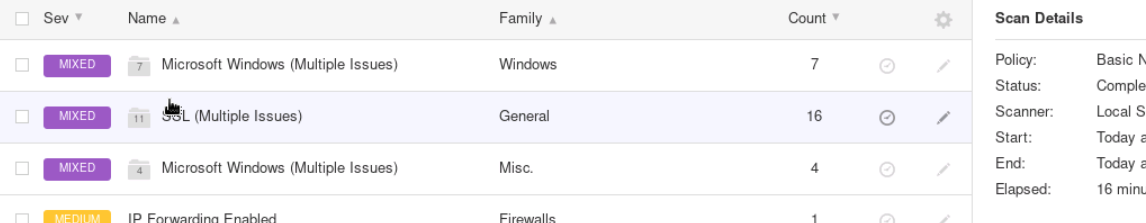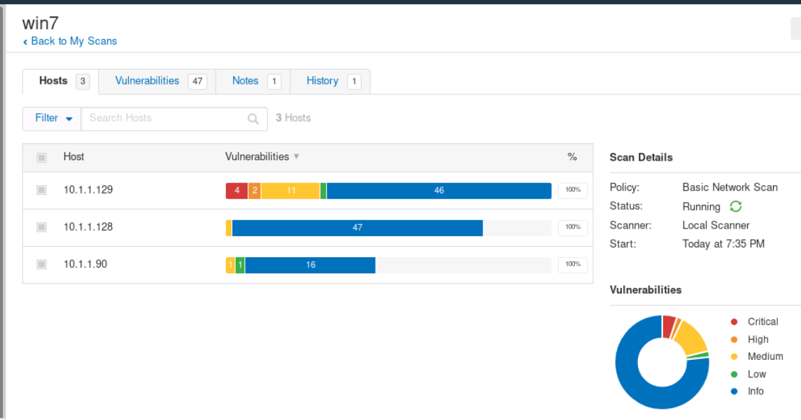 扫描结束后,Nessus会很直观的显示出目标网段的安全情况。下图显示了整个网段的安全信息。Nessus将安全问题归类为Info/Low/Medium/High/Critical五个等级,其中Critical等级的问题是最危险的,Info级别的问题通常是无关痛痒的信息显示问题。