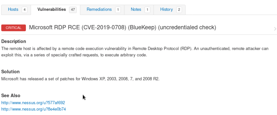 选中高危漏洞,Nessus给出了该漏洞的介绍、风险信息、解决方案等详细信息。Risk information对于攻击者来说非常有用,可以根据Risk information去Google搜索是否存在已知的漏洞利用Exp。