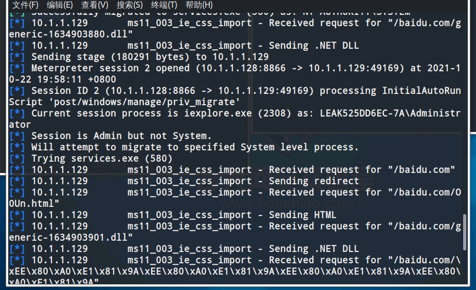 11.在 Win7靶机打开IE,访问http://10.1.1.128:8060/baidu.com,模拟受害者误点击网页,靶机IE如下图所示,攻击者Metasploit显示如下图所示信息表明攻击成功。
