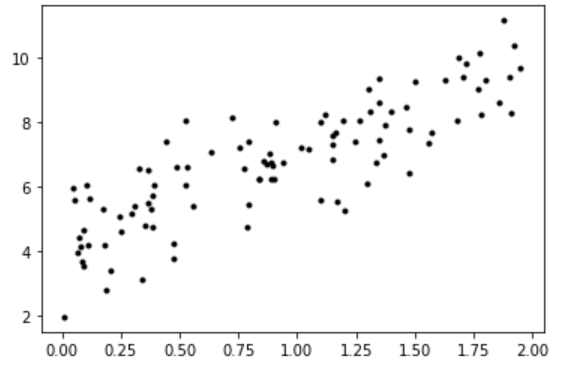 # an example import numpy as np import matplotlib.pyplot as plt X = 2 * np.random.rand(100, 1) y = 3 * X + 4 + np.random.randn(100, 1) plt.plot(X, y, 'k.') plt.show()