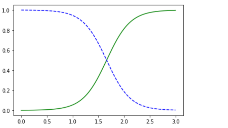 log_reg.predict([[1.7], [1.5]]) # array([1, 0], dtype=uint8) # predict(): Logical value predict_proba(): predicted probability