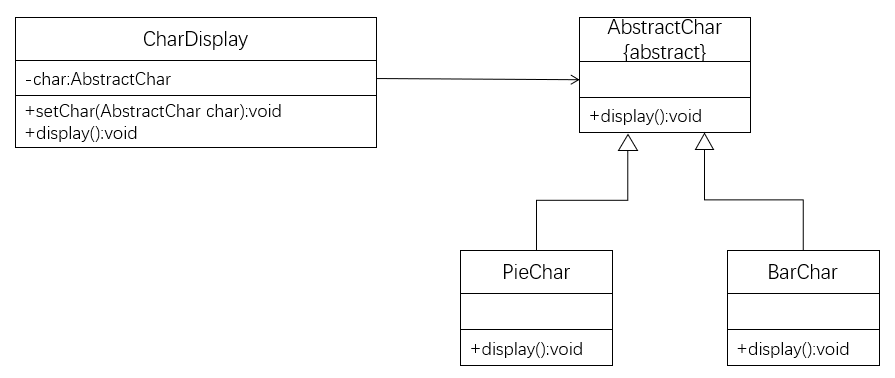1 public abstract class AbstractChar { 2 3 public abstract void display(); 4 5 } 6 7 public class CharDisplay { 8 9 private AbstractChar ch; 10 11 public void setCh(AbstractChar ch) { 12 this.ch = ch; 13 } 14 public void setChar(AbstractChar ch) 15 { 16 //...... 17 } 18 19 } 20 21 public class PieChar extends AbstractChar{ 22 23 @Override 24 public void display() { 25 //...... 26 } 27 28 } 29 30 public class BarChar extends AbstractChar{ 31 32 @Override 33 public void display() { 34 //...... 35 } 36 37 }