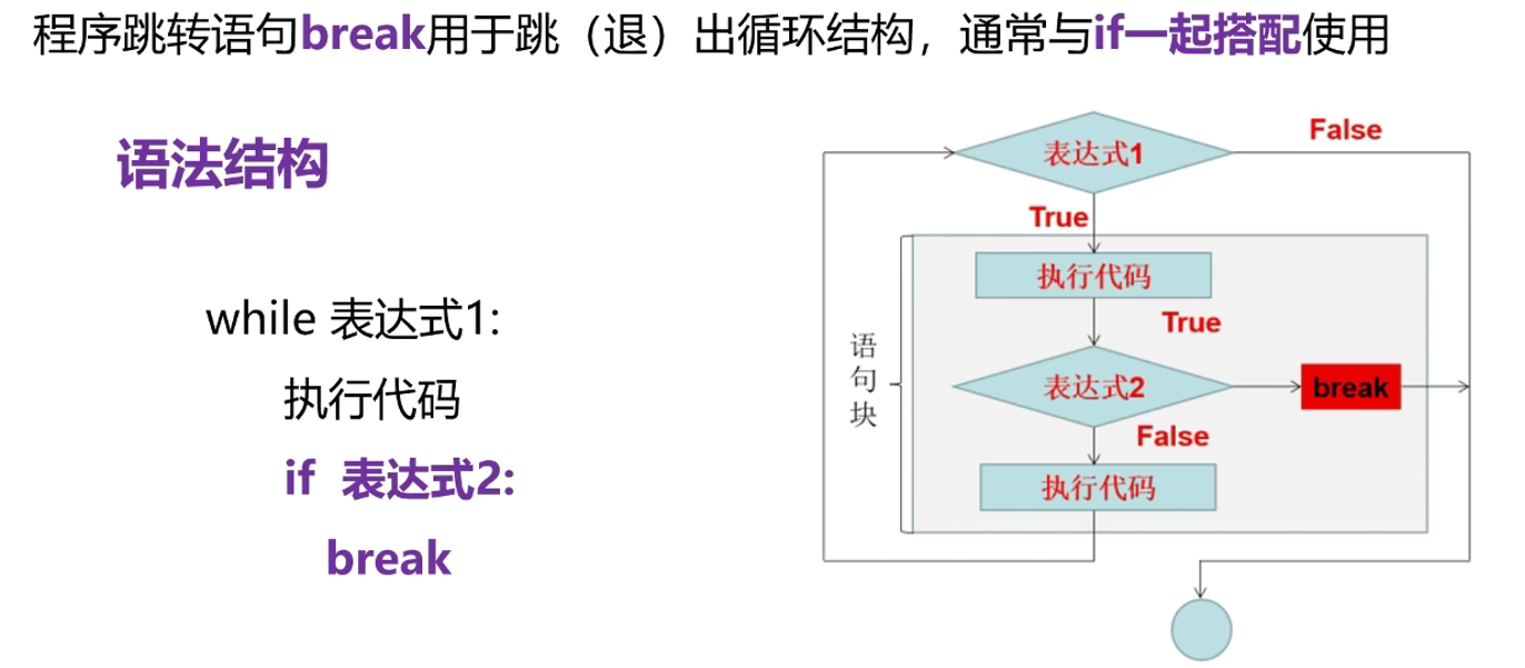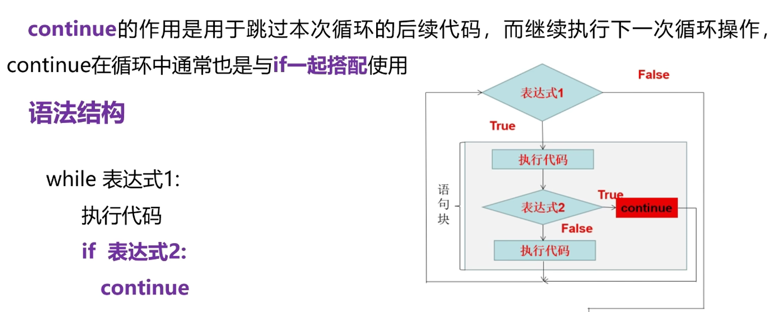 break和continue只能用在循环结构中,break用于退出整个循环结构,continue用于结束本次循环而进入下一次循环。
