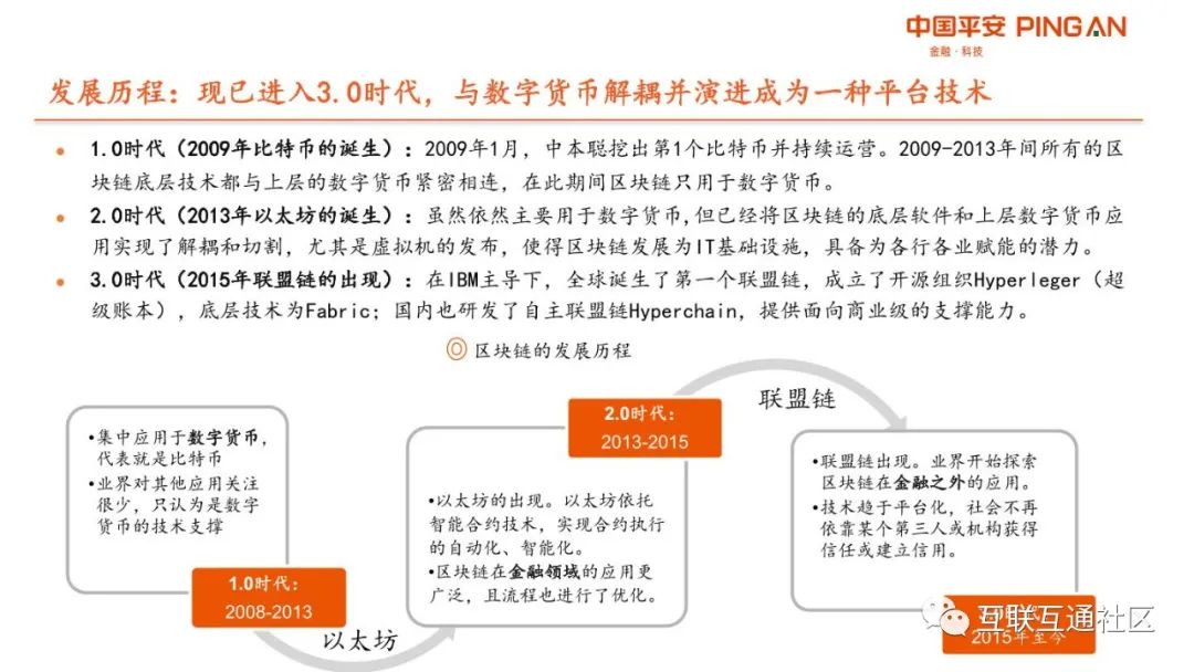 区块链的本质是一种多中心、不可篡改的数据结构和记账方式。区块链起源于2008年中本聪关于比特币的 一篇论文,其作为比特币的底层技术进入大众视野。经过近10年的发展,区块链已经从最初单纯支持数字 货币的1.0时代发展到了当前的3.0时代,与比特币实现了解耦,并开始应用于金融之外的多个领域。