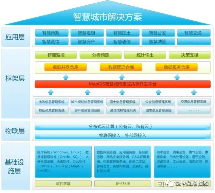 5. 智慧应用层:这一层的内容就是我们通常听到的各种概念,比如涉及民生的智慧医疗,智慧旅游,社会保障,智慧家政;涉及城市管理系统的智慧交通、智慧城管,规划建设,智慧环保,智慧社区;涉及企业服务的行政审批,报税纳税,信用管理;涉及政府政务的智慧政务等等,这些基于各种行业或领域的智慧应用及应用整合,为社会公众、企业、城市管理者等提供整体的信息化应用和服务。